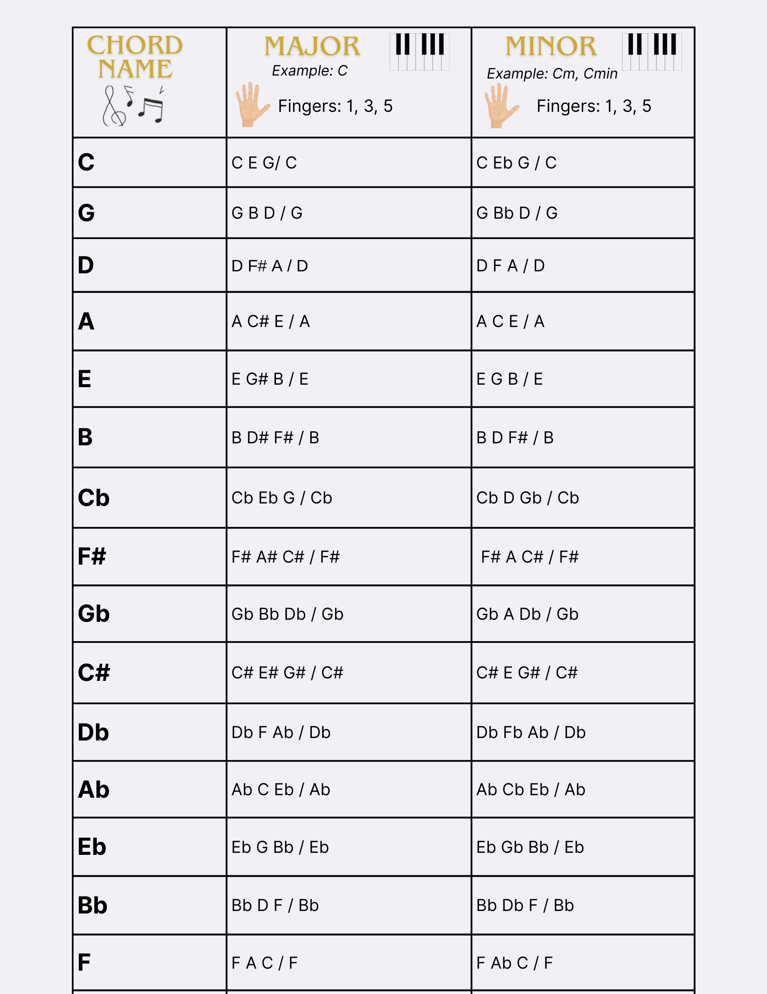 Easily grasp and play even the most intricate piano chords with our simplified chart.
