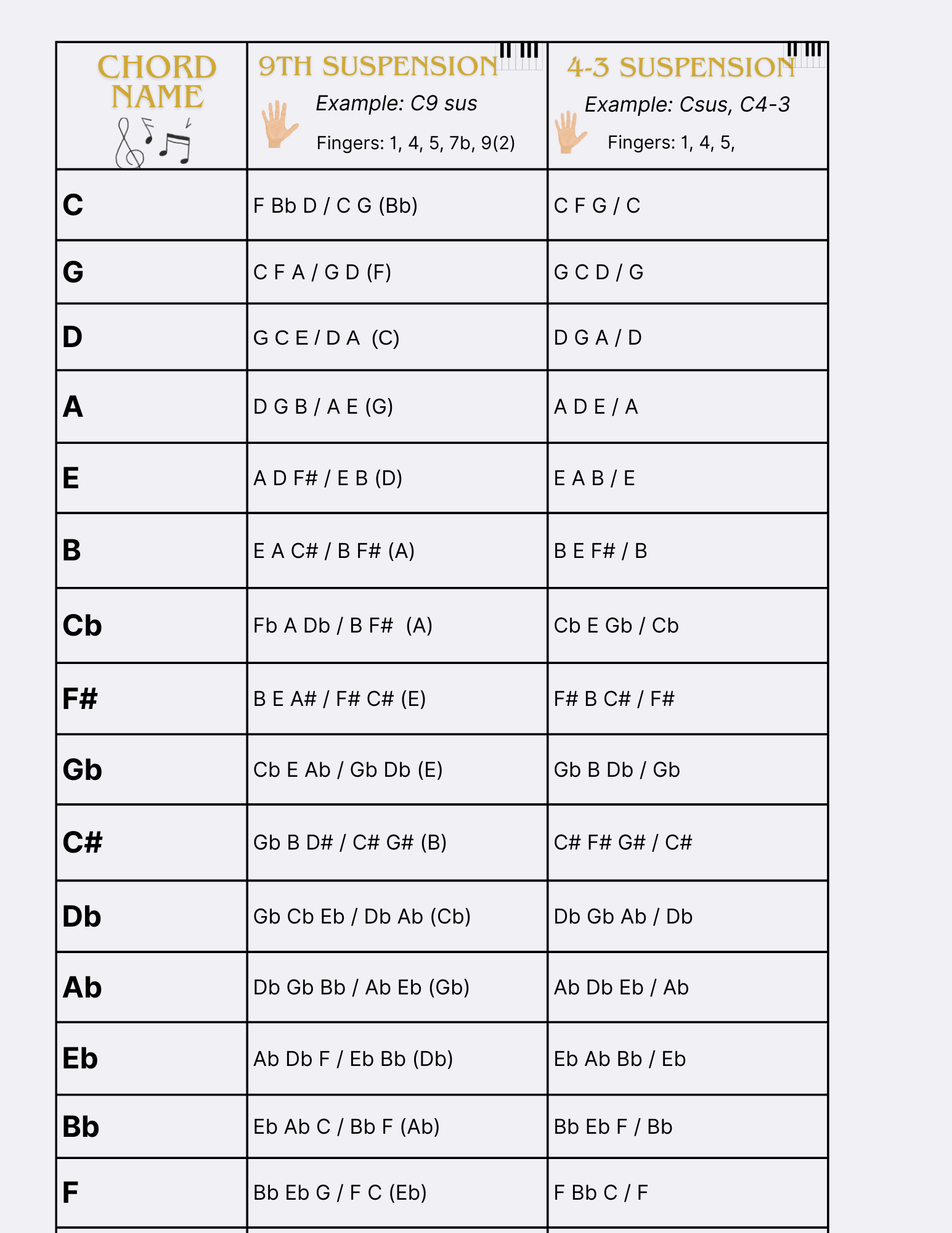 Our piano chord chart is designed to revolutionize the way you approach piano playing. It provides a straightforward and comprehensive guide to understanding and playing various chords, empowering you to elevate your musical skills and enjoyment. Say goodbye to confusion and hello to harmonious melodies with our innovative chart. Chart Includes: Major chords, minor chords, augmented fifth, major sixth, minor sixth, diminished, major seventh, dominant seventh, minor seventh, half diminished, fully diminished 7th, dominant ninth, flatted ninth, raised ninth, major ninth, minor ninth, dominant eleventh, augmented elevenths, dominant thirteenth, 7th suspension, 9th suspension, 4-3 suspension, 2-1 suspension major, 2-1 suspension minor.